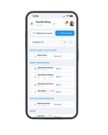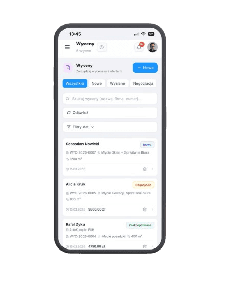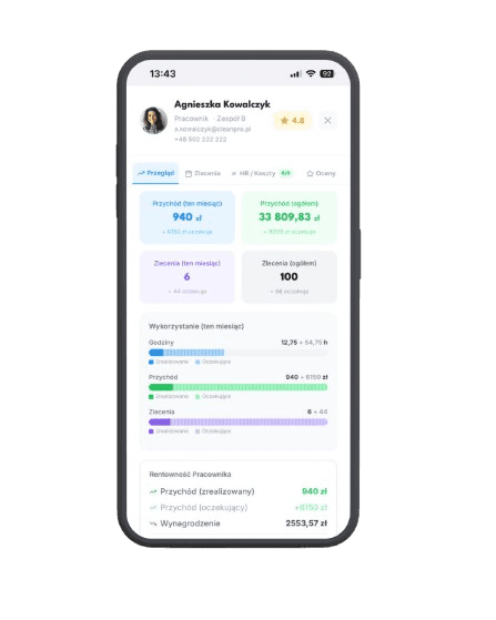 Aplikacja z pełnym podglądem na Twoją firmę — przychody, zlecenia, zespół i statystyki w jednym widoku. Wszystko pod kontrolą od pierwszego logowania. Kompletne narzędzie do zarządzania firmą sprzątającą — od klientów po finanse.