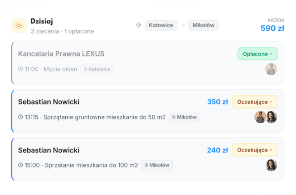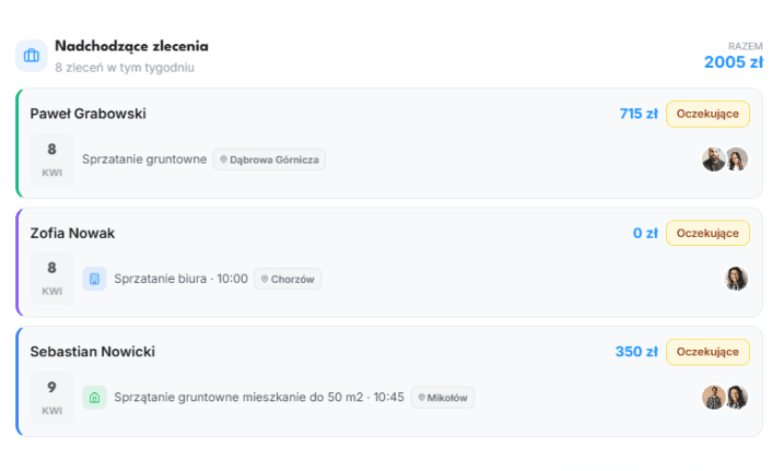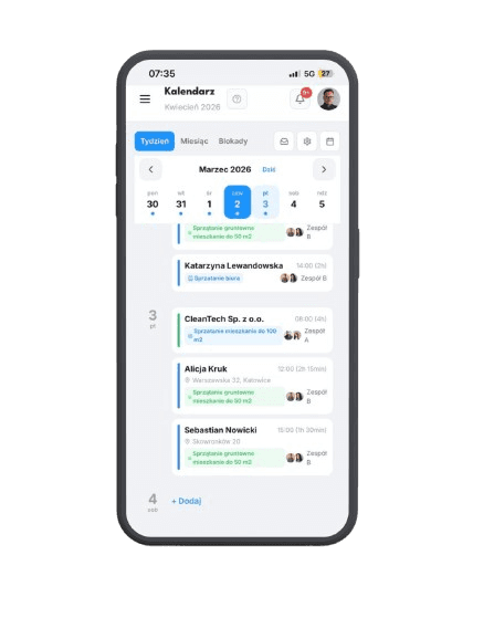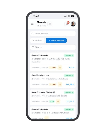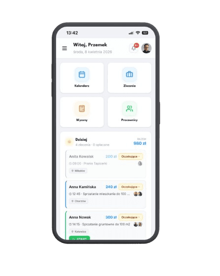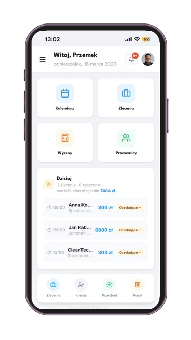 Zlecenia, zespół, klienci, finanse — wszystko w jednym miejscu, na każdym urządzeniu. Stworzone dla polskich firm sprzątających